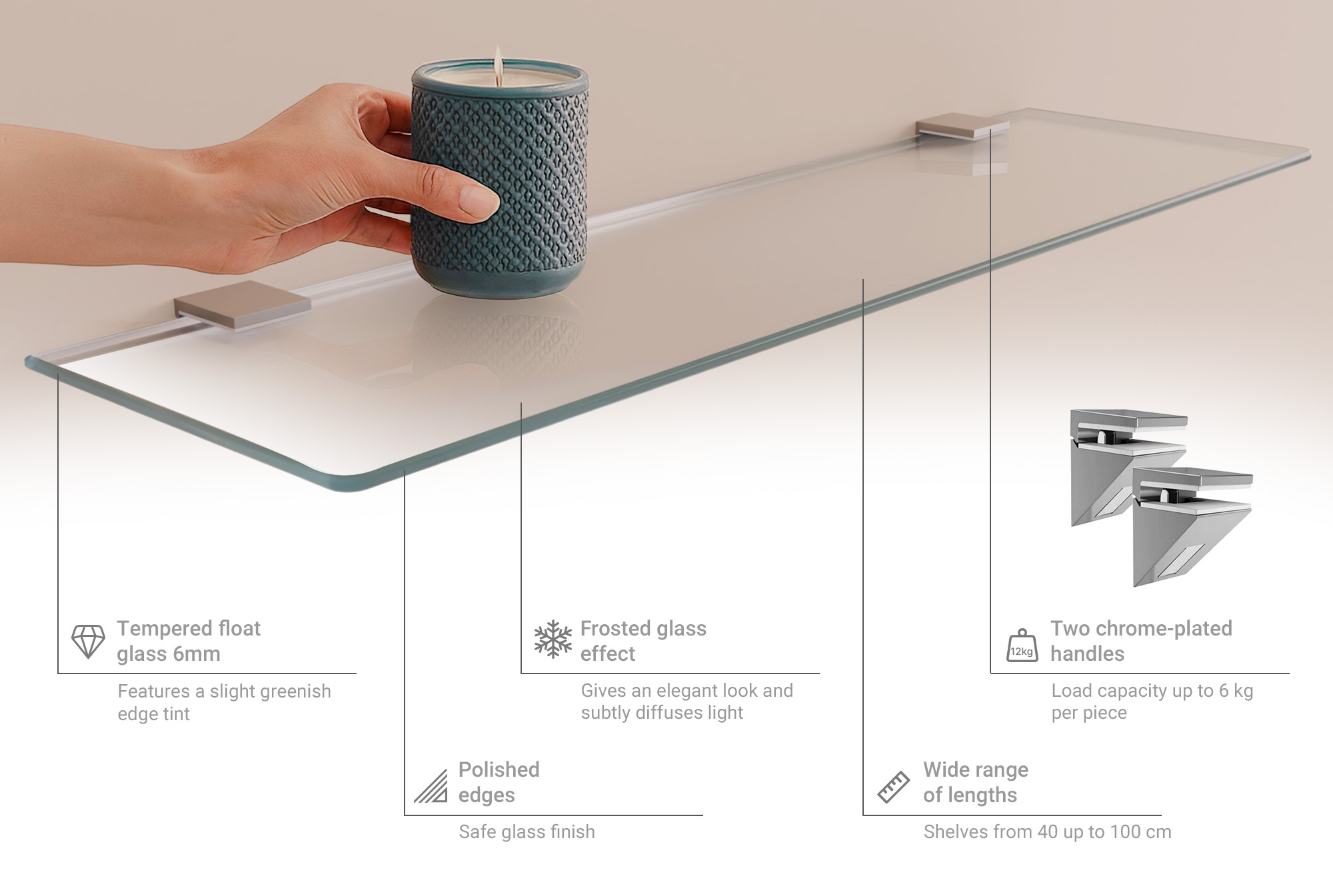 - Contemporary, low-profile design: The slim 6 mm glass thickness keeps the shelf visually light so it functions as a clear floating shelf for mirror areas and small storage without dominating the room.
