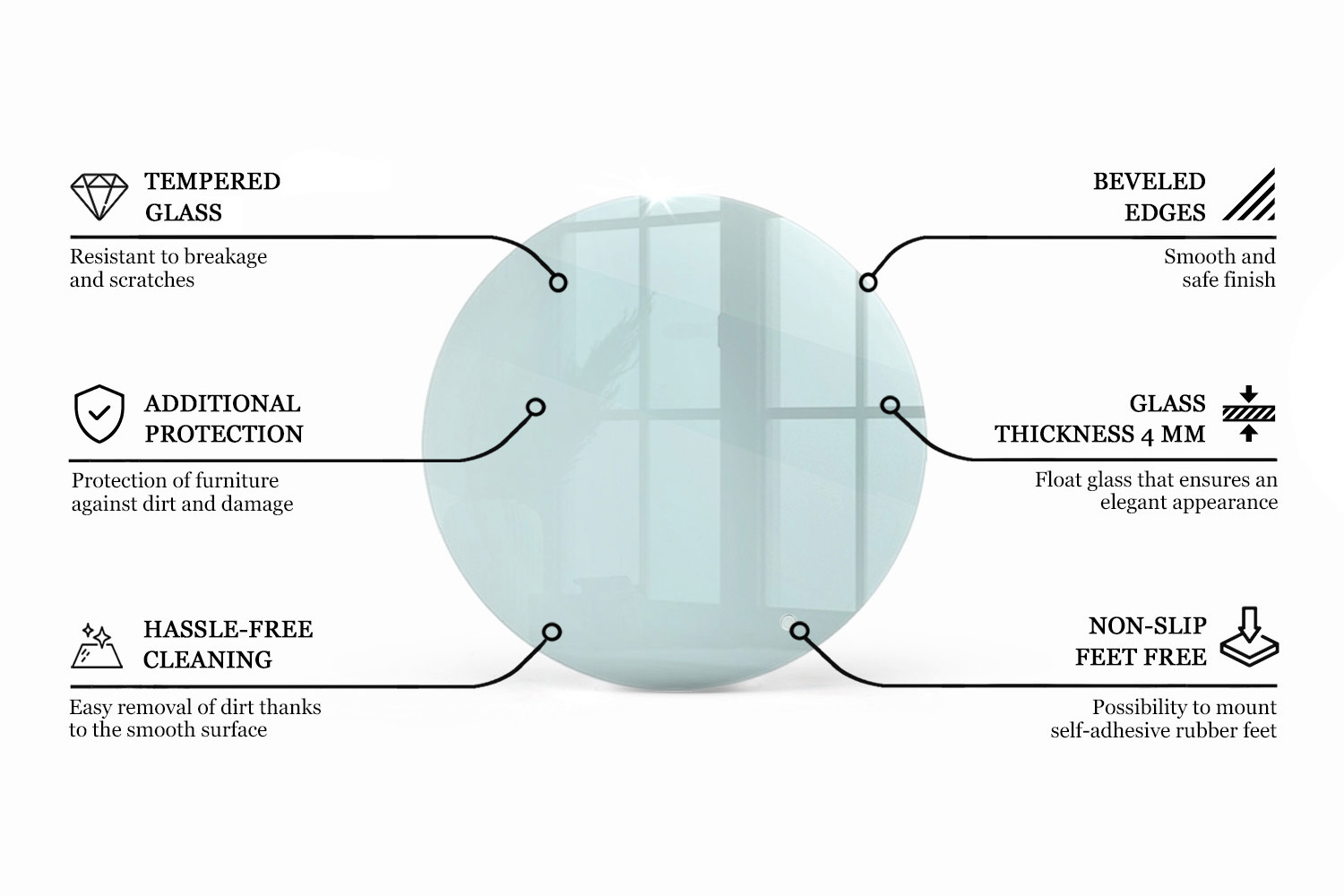 Discover an exceptional way to refresh your interior—choose a transparent glass table top made of elegant tempered glass. Its circular shape and minimalist design make it a genuine decoration for any room. This subtle yet modern element adds a sense of lightness and spaciousness to dining rooms, living areas, or offices. The glass surface reflects light beautifully, creating an atmosphere of elegance. It is a perfect solution for those who value style, aesthetics, and originality in interior design. Regardless of whether your home is maintained in a modern, Scandinavian, classic, or industrial style—this circular glass table top will harmoniously fit into any environment.